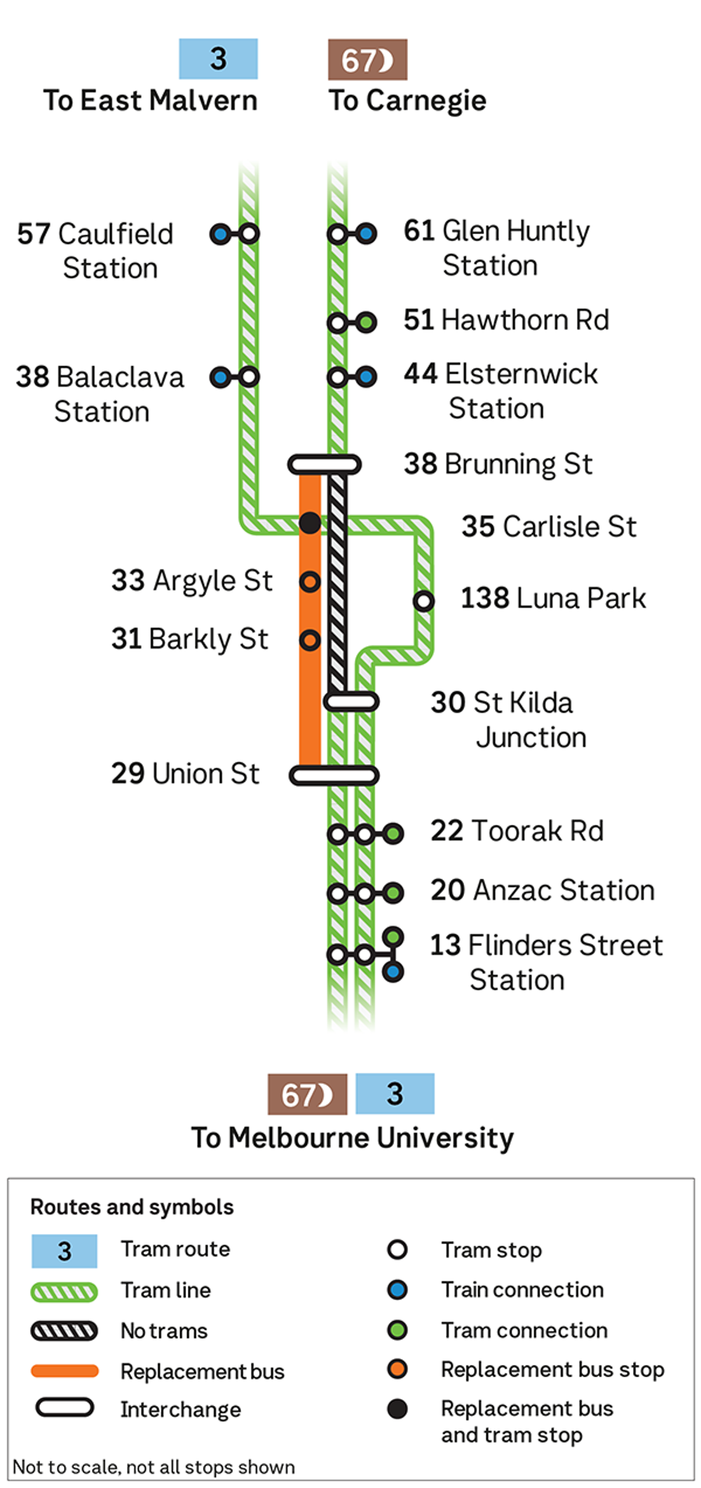 Route 67 trams run in sections with no trams between Stop 38 Brunning Street and Stop 30 St Kilda Junction.